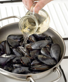Lavate e spazzolate bene 500 g di cozze, mettetele in un largo tegame con mezzo bicchiere di vino bianco e fatele aprire su fuoco vivo. Scolatele, scartate quelle ancora chiuse e filtrate il liquido di cottura.