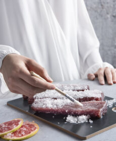 Appoggiate l'involucro in una pirofila, copritelo con un vassoio più piccolo con sopra un peso e mettete in frigo per 6-8 ore. Togliete la pellicola, eliminate le fette di pompelmo, estraete i filetti di tonno, sciacquateli e asciugateli con carta da cucina e affettateli.