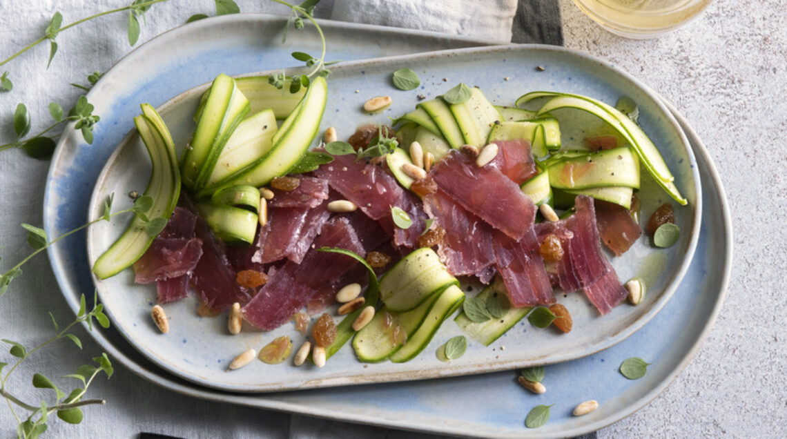 Marinato nel Campari il filetto di tonno sposa le note agrumate del pompelmo. Una manciata di uvetta e pinoli e nastri di zucchine lo rendono un secondo gourmet