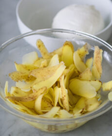 L'arte del recupero è interessata anche alle bucce di patate, riutilizzabili in molti modi. Oltre a quello che vi abbiamo proposto nella nostra ricetta, potete friggerle per farne chips oppure passarle al forno e usarle per accompagnare una zuppa al posto dei crostini o, una volta tritate, per sostituire il formaggio su una pasta o un risotto.