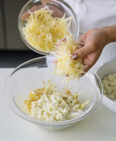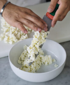 Scolate bene la mozzarella dal suo latticello, tagliatela a fette, tritatela grossolanamente e trasferitela in una ciotola.
