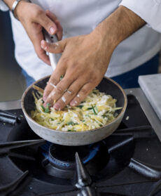 Lavate le bucce in acqua, scolatele e asciugatele. Radunatele su un tagliere e tagliatele a julienne.
