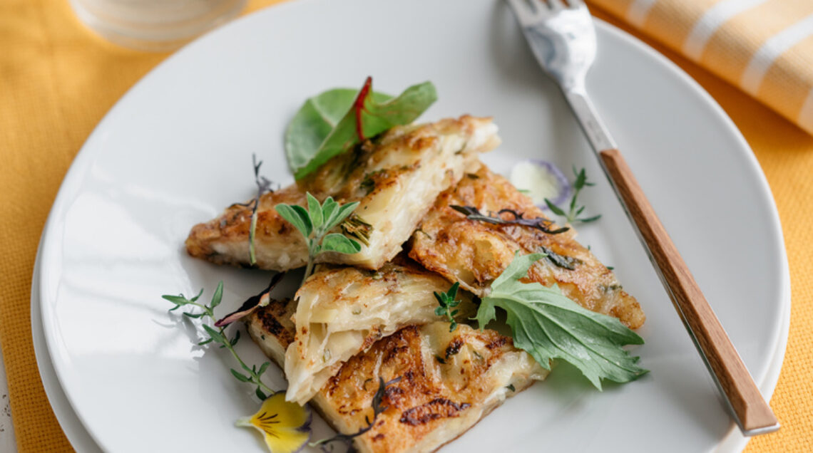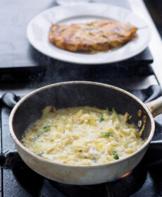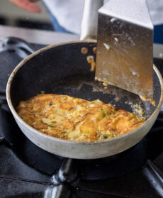 Cuocetelo per 5 minuti senza toccarlo, appena la base è dorata, leggermente rappresa ma ancora morbida, rovesciate la frittata e trasferitela su un piatto.