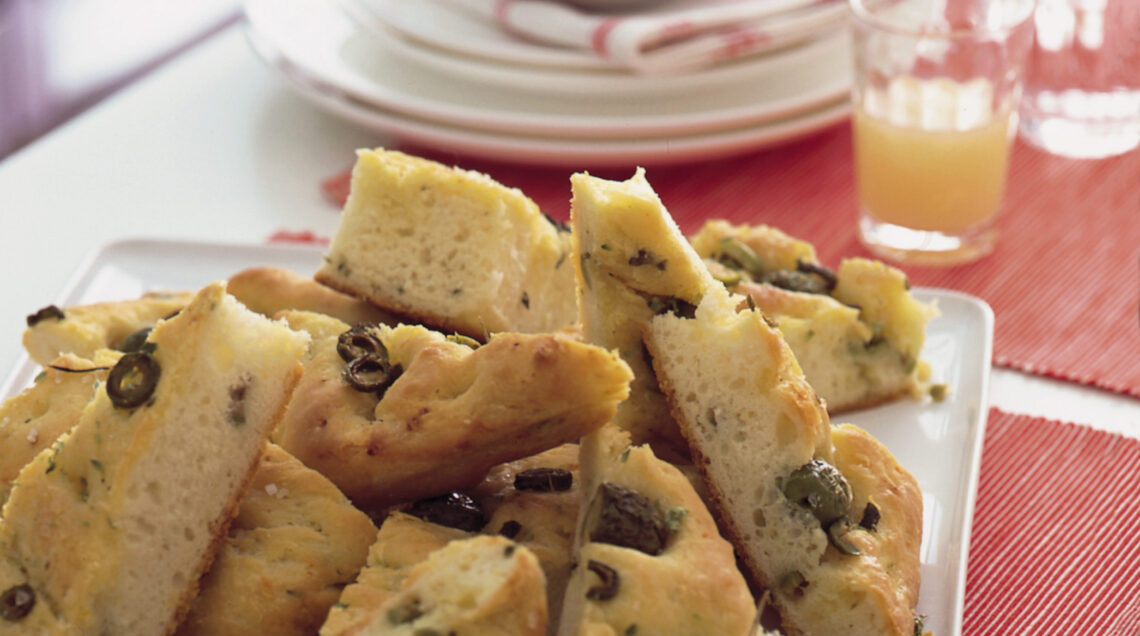 2) Impasta ulteriormente le focacce olive e rosmarino ottenute e stendile con le mani in 2 teglie unte d'olio per poi insaporirle con poco sale, le olive ed il rosmarino rimasti.