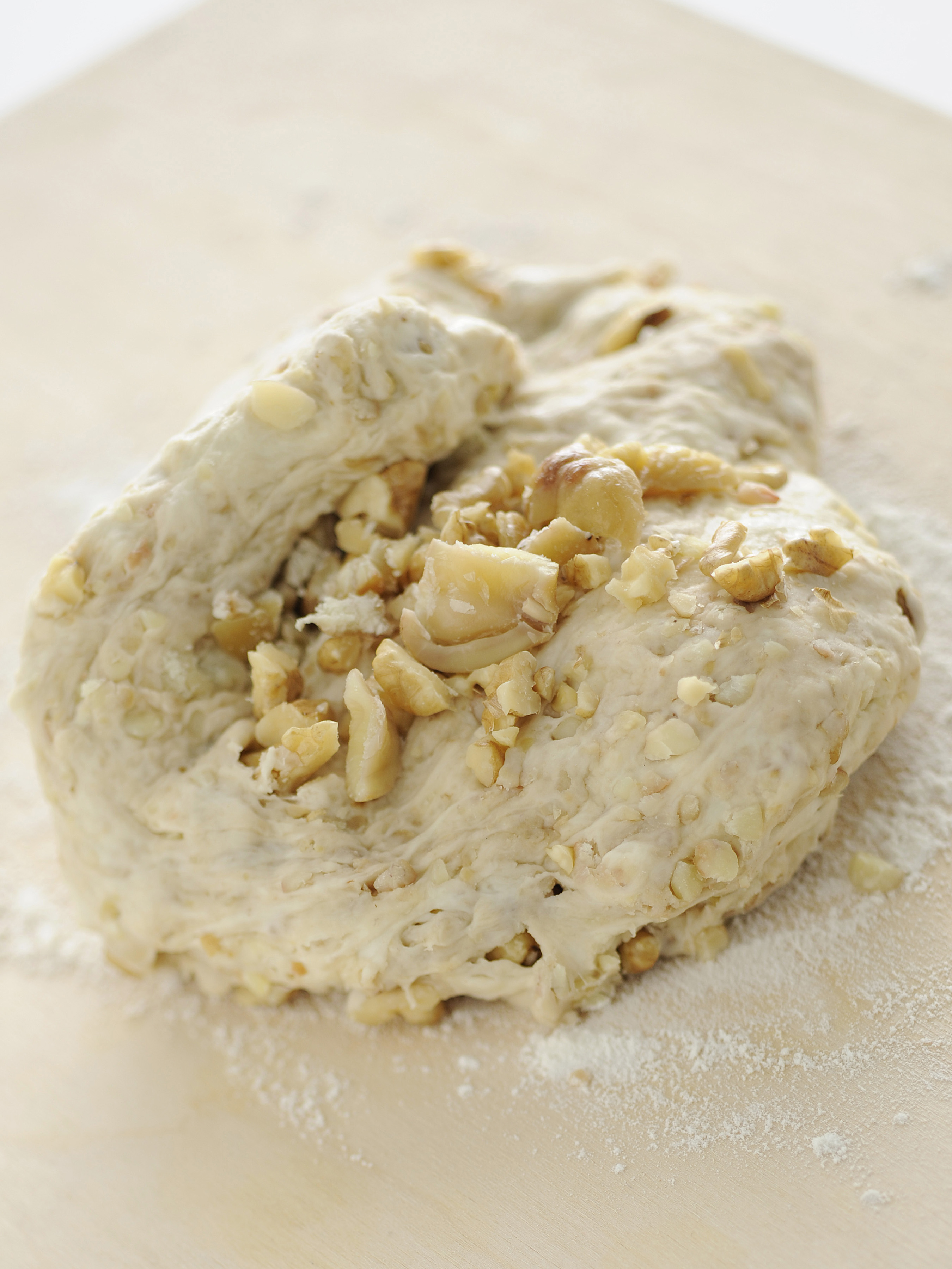 3) Lavora la pasta da pane per le focaccine unendo poco per volta 2 cucchiai di olio, le noci tritate finemente e private di eventuali pellicine e residui di guscio, le castagne, il sale, un pizzico di zucchero e un cucchiaino di grani di pepe sminuzzati.