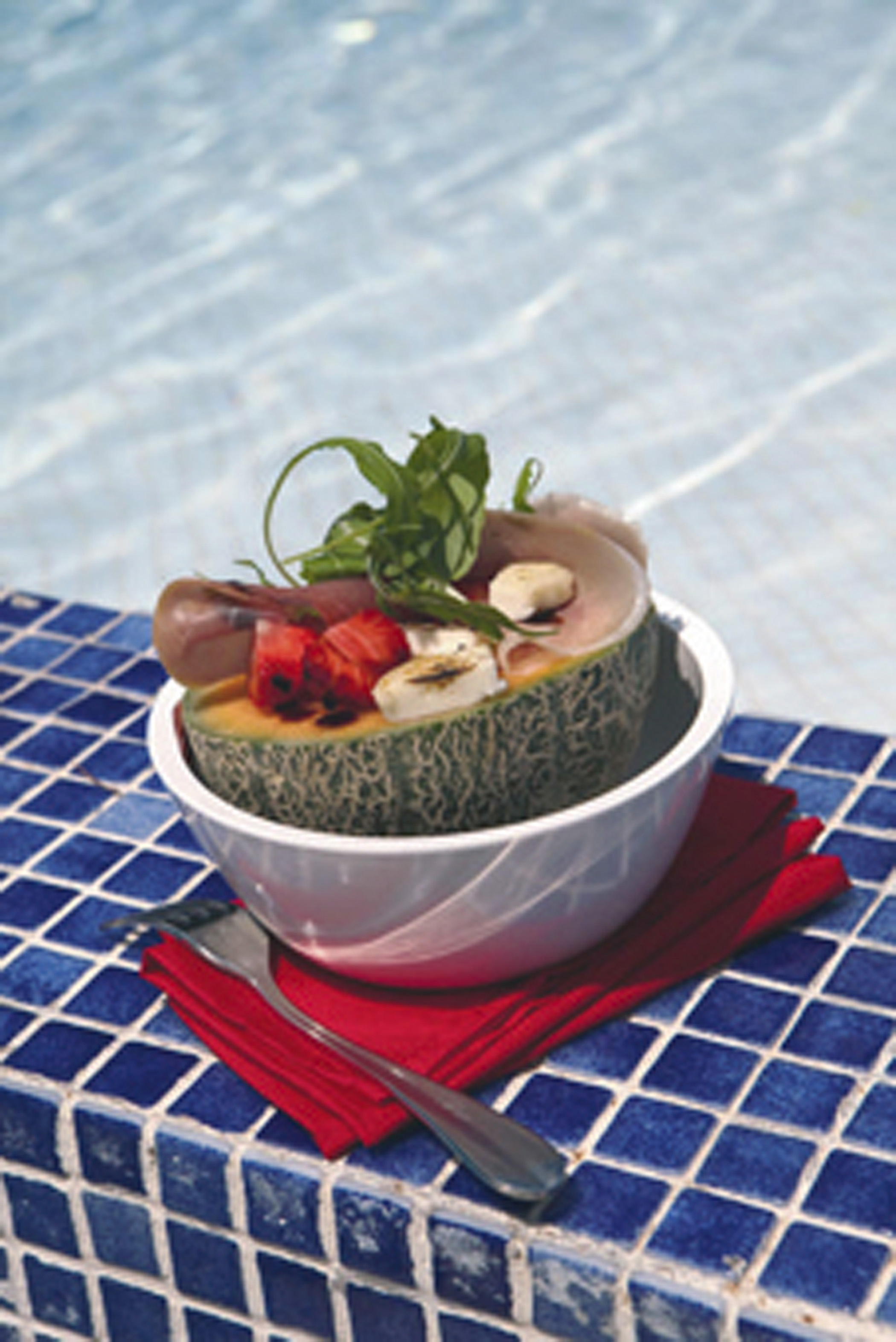 4) Taglia i meloni a metà, privali dei semi, disponi all'interno le fragole, il prosciutto, il formaggio tiepido e ultima con la rucola.