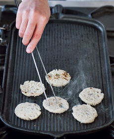 Tagliate le fette di pane mollicoso con un tagliapasta rotondo a dischi del diametro della mozzarella, poi passatele sulla griglia ben calda, girandole da una parte e dall’altra.
