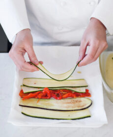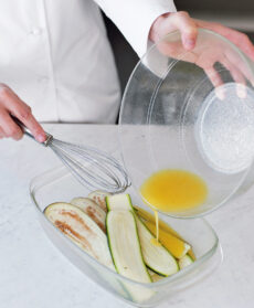 Tagliate melanzane e zucchine a fettine di circa 1/2 cm di spessore, sistematele in un recipiente di vetro. Preparate una marinata emulsionando il succo dell’arancia non trattata e la sua scorza grattugiata con 2 cucchiai di olio, una presa di sale e di pepe. Versate la marinata sulle verdure e lasciatele riposare per 20 minuti.