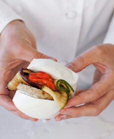 A centro sistemate i dischi di pane e le verdure grigliate e i peperoni, chiudete i “panini” e serviteli.