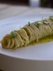 1) Strofinate l’interno di un tegame smaltato con gli spicchi d’aglio e fatevi scaldare 6 bicchieri di vino e il Kirsch, aggiungendo abbondante pepe e una grattata di noce moscata.