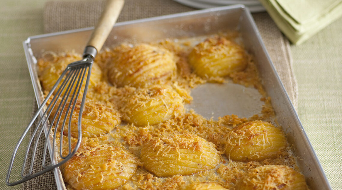 2) Fate fondere il burro, mescolatelo all'olio e distribuitene la metà sul fondo di una teglia da forno, coprite tutta la base con le patate ordinandole in un solo strato, bagnatele con il restante composto di olio e burro, salatele, pepatele e cuocetele in forno già caldo a 180° per circa 40 minuti. Spennellatele spesso con il loro condimento, quindi proseguite la cottura a 200° per altri 10 minuti senza più aprire il forno.