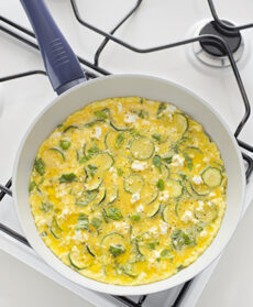 La frittata con le zucchine rosolate e il miscuglio di uova e ricotta è profumata con basilico e maggiorana. Il tocco croccante sono i pinoli tostati