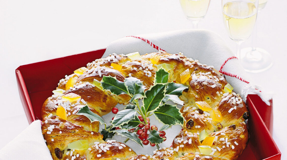 2) Ultima la ricetta della ghirlanda con uvetta e canditi con la granella di zucchero e infornala a 180° per 25-30 minuti.