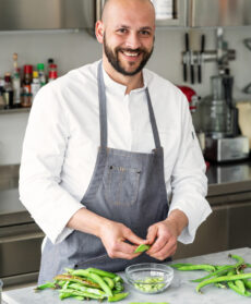 Sgusciate le fave: ne otterrete circa 220 g sgranate. Intanto, portate a bollore in una pentola abbondante acqua salata con la cipolla sbucciata.