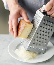 Grattugiate il pecorino. Sbollentate le fave in acqua salata 3 minuti, scolatele, trasferitele in acqua e ghiaccio, poi sgocciolatele e sbucciatele.