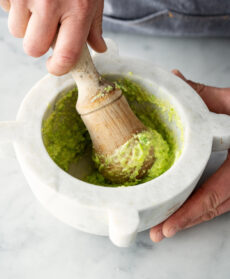 Mettete le fave nel mortaio (tranne qualcuna) con il pecorino e, versando a filo 120 ml d'olio, lavorate con il pestello per ottenere un pesto cremoso.