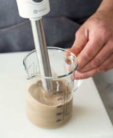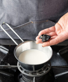 Frullate latte e aglio nero con il mixer per ottenere una salsa liscia e regolate di sale.