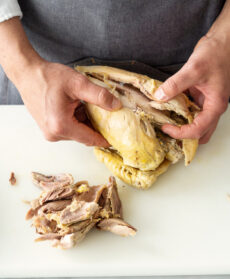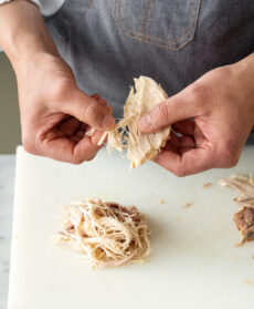 Sgocciolate il pollo e spolpatelo eliminando la pelle, gli ossi, i nervetti e gli altri scarti.