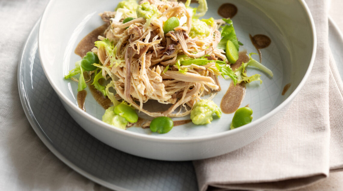 Sfilacciate la carne con le mani e conditela in una ciotola con olio, sale e pepe. Dividetela nei piatti con l'insalatina, lavata e asciugate, le fave intere tenute da parte, il pesto di fave e alcune gocce di latte all'aglio nero, servendo il resto della salsa a parte.