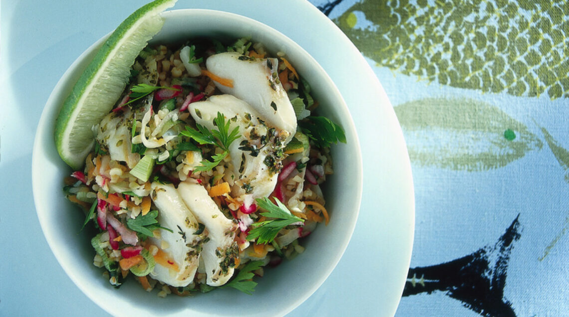 Il pesce cotto in forno è servito con bulgur alle verdure e profumato con lime e timo. Un secondo fresco per le giornate d'estate