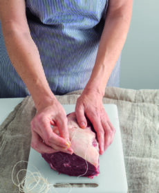 Legate 800 g di codone di manzo non sgrassato con lo spago da cucina; tritate 2 foglie di alloro con 1 spicchio d'aglio sbucciato, sale e pepe. Cospargete la carne con il trito preparato e irroratela con poca salsa Worcestershire.