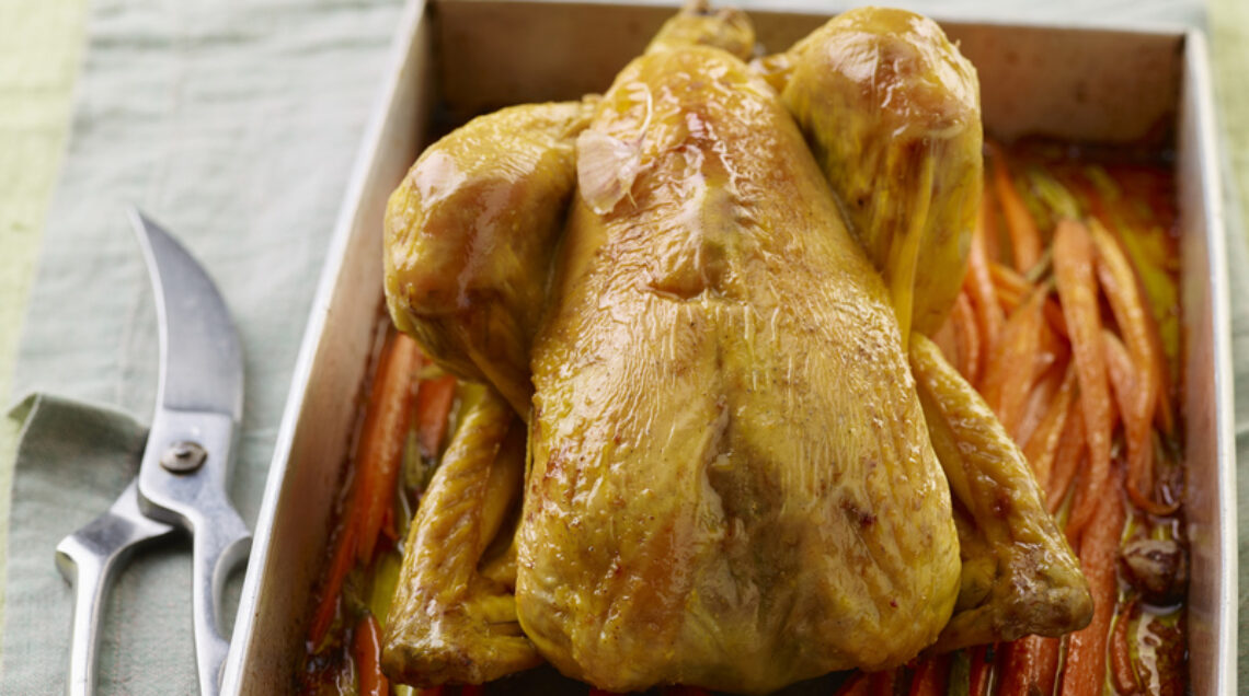 3 Nel frattempo, pelate le carote, tagliatele a spicchi nel senso della lunghezza e scottatele in acqua salata in ebollizione per 5 minuti, scolatele e tenetele da parte. Quando sono trascorsi 45 minuti di cottura in forno a 180°, unite le carote al pollo e proseguite per altri 30 minuti. Poi togliete dal forno e servite subito.