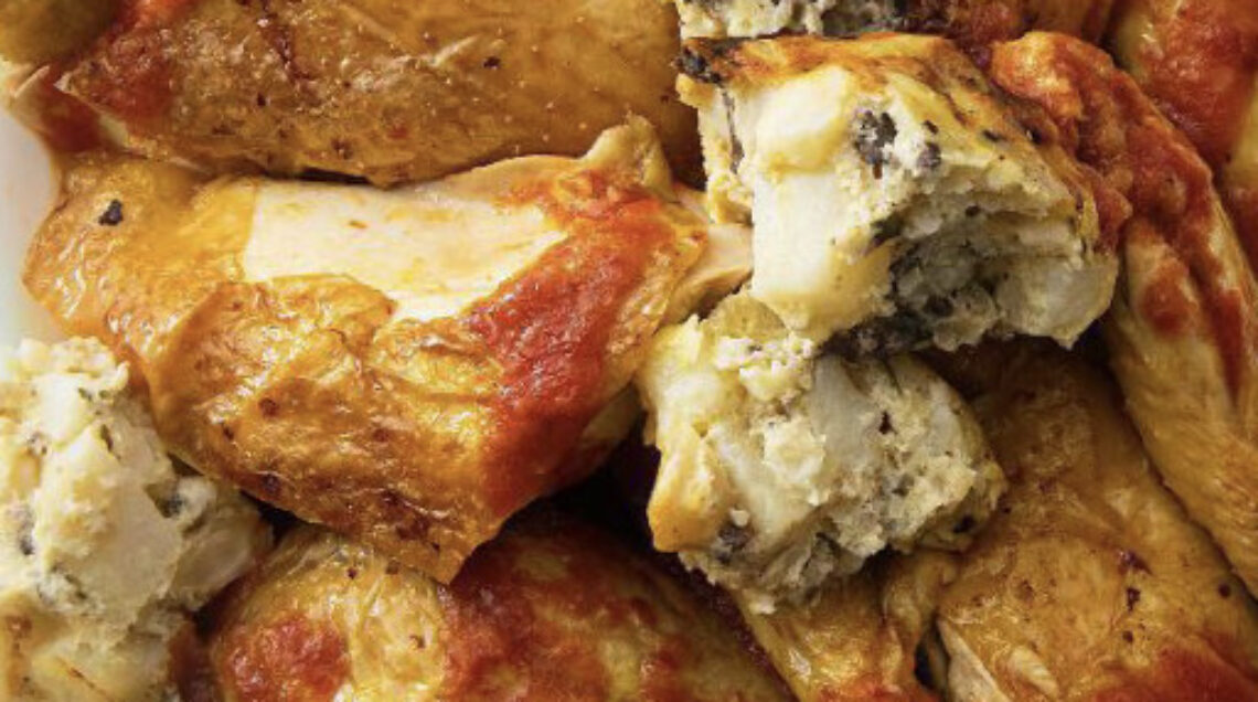 2 Tritate le mandorle e il prezzemolo ben lavato e mecolateli con la mollica sbriciolata, le uova sbattute, le interiora e il grana; impastate bene il tutto e salate se necessario. Lavate il pollo dentro e fuori, asciugatelo con carta da cucina, salatelo internamente, riempitelo con il ripieno; quindi cucite l'apertura con ago e filo da cucina.