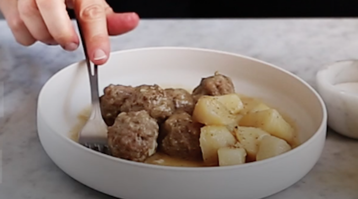9) Rimettete patate e polpette nel recipiente, regolate di sale e di pepe e impostate velocità 3, temperatura 90°C, per 3 minuti;