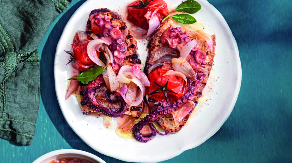 3 Tostate il pane e distribuitelo nei piatti. Adagiatevi sopra i tentacoli del polpo, i pomodori e la verdura e bagnate con un po' di brodo. Condite con olio e succo di limone.