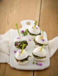 3) Distribuisci sulle fette di pane, alternandole, la mozzarella di bufala a fettine sottili, i peperoni tagliati a strisce e le foglie di basilico.
