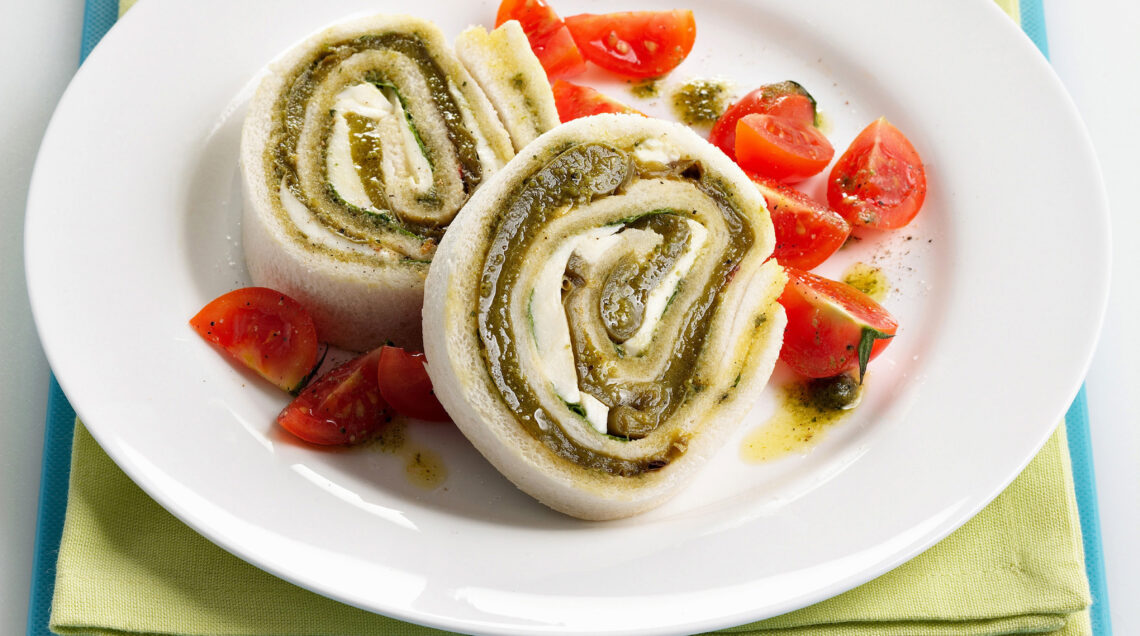 2) Adagia le fette di pane su un foglio di pellicola da cucina, sovrapponendole un po' e formando un rettangolo di circa 40x20 cm. Schiacciale leggermente con un matterello e spalmaci sopra il pesto.