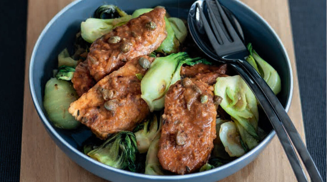 2 Scolate le fettine, infarinatele e doratele in padella con 4 cucchiai di olio. Trasferite il tempeh in un piatto, versate nella padella metà della marinata filtrata, il succo del limone e i capperi, portate a bollore, immergetevi le fettine e glassatele.