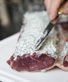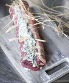 Lavate le foglie di menta, sbollentatele per pochi secondi in acqua salata, scolatele, raffreddatele in acqua e ghiaccio, strizzatele e tritatele finemente. Quindi, in una ciotola, mescolatele con il formaggio, il peperoncino, sale e pepe. Srotolate la sella, spalmate la parte magra con il formaggio aromatizzato e riavvolgetela lasciando all'esterno il lato più grasso; legatela con la rafia lasciando che fuoriesca un po' di crema di formaggio e trasferitela in una teglia rivestita di carta da forno.