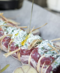 Un secondo di carne ovina come vuole la tradizione pasquale. Profumato con teste d'aglio e farcito con formaggio di capra cuoce in forno per meno di mezz'ora