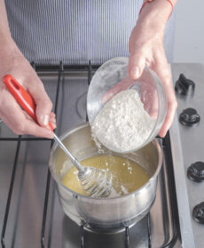 Fate sciogliere il burro a fuoco dolce, quindi unite la farina e mescolate con una frusta fino a ottenere una crema senza grumi. Aggiungete il latte a filo continuando a mescolare e fate addensare la besciamella; conditela con sale, pepe e noce moscata.