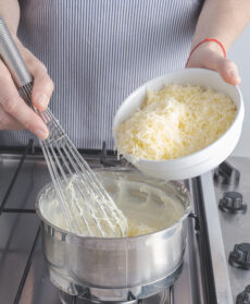 A fuoco spento, unite il parmigiano e l'emmentaler grattugiati mescolando per amalgamarli.