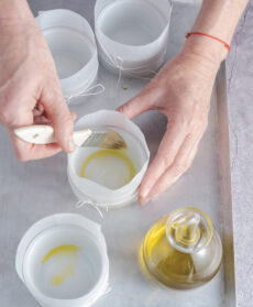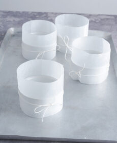Predisponete 4 cocotte da porzione. Preparate 4 strisce di carta da forno alte il doppio delle cocotte e un po' più lunghe della loro circonferenza. Avvolgetele intorno alle cocotte e fissatele con spago da cucina.