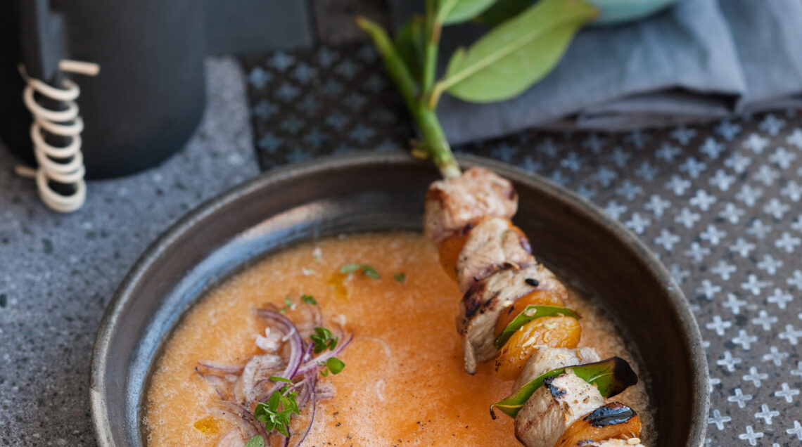4) Cuoci gli spiedini di agnello e albicocche secche su una piastra calda un paio di minuti per lato. Servili con la zuppetta di melone, completando con il cipollotto rimasto affettato finemente, timo, un filo d'olio e pepe a piacere.
