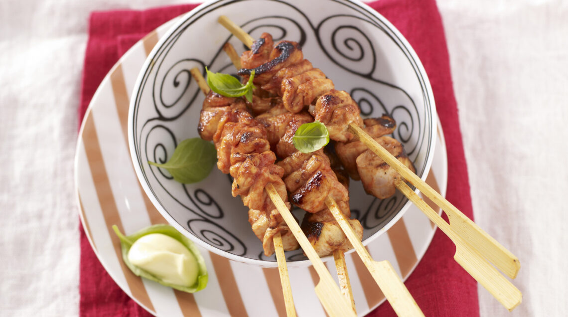 3) Scalda 1 cucchiaio d'olio in una padella antiaderente, unisci gli spiedini e cuocili per 5-6 minuti, rigirandoli su tutti i lati. Regola di sale e servili con la maionese mescolata con lo spicchio d'aglio sbucciato, privato dell'anima centrale e grattugiato.