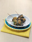 2) Scola le striscioline di pollo, elimina la cipolla e infila la carne sugli stecchi in modo da creare dei nastri ondulati.