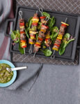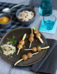 3) Scalda una piastra di ghisa, ungila con poco olio e cuoci gli spiedini di polpette girandoli più volte, in modo che si dorino uniformemente. Servi gli spiedini molto caldi accompagnandoli con la salsa di ceci e, se ti piace, con pomodorini e misticanza.