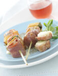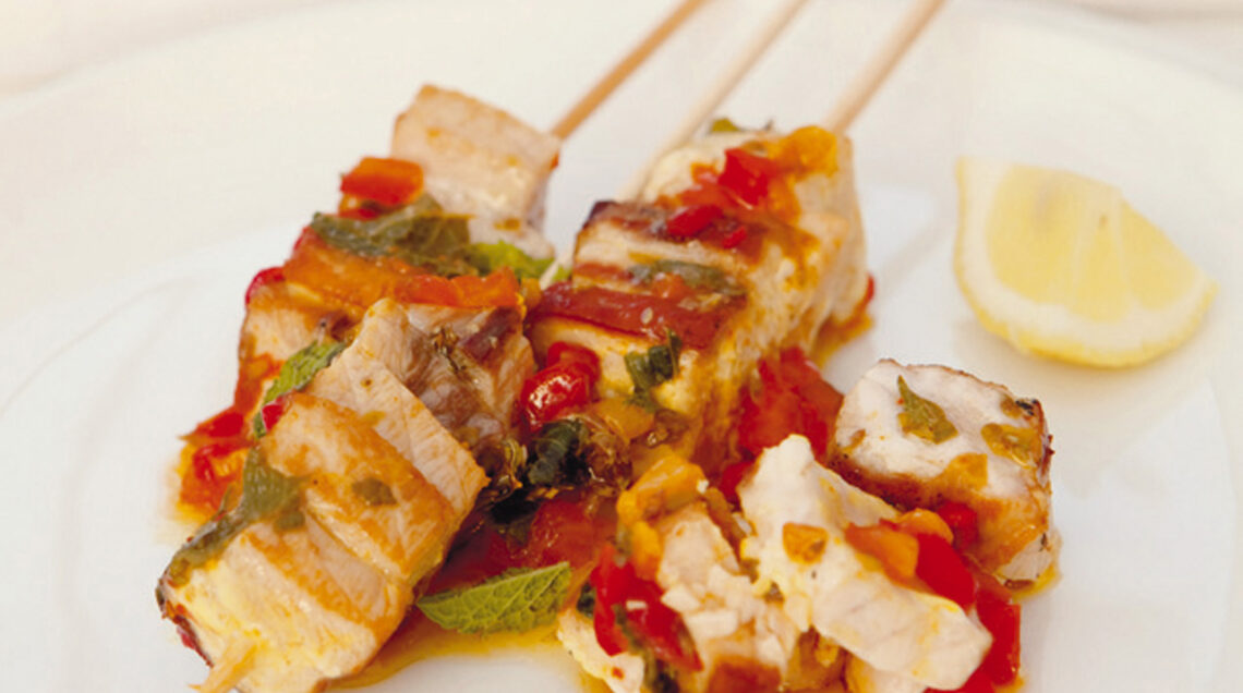 3) Elimina la pelle dalle fette di pesce spada e taglia la polpa a dadi di 3 cm di lato. Infilza 5-6 pezzetti sugli spiedini scolati, condiscili con un filo di olio e un pizzico di sale e cuocili sulla piastra calda un minuto per lato. Intingi gli spiedini di spada con marinata nella salsa e lasciali raffreddare.