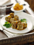 2) Scalda mezzo dl di acqua, aggiungo lo zafferano e spegni. Mescola in una ciotola le verdure preparate con lo zafferano diluito, 4 cuchiai di olio, una presa di sale, un pizzico di peperoncino e di origano, il succo del limone filtrato e 5-6 foglie di menta lavate, asciugate e spezzettate.