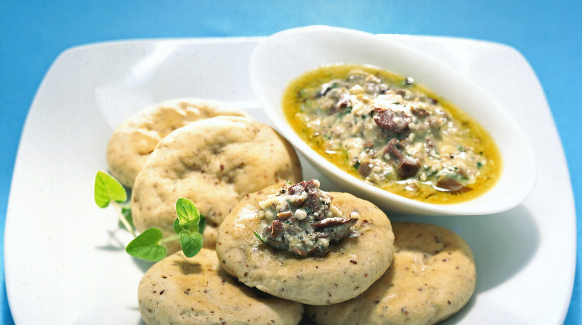 3) Servi gli stuzzichini alle olive realizzati con il pesto di ricotta preparato in precedenza.