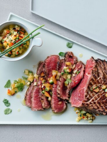 Il controfiletto appena scottato sulla ghisa è servito con una fresca salsina a base di pomodori e succo di limone