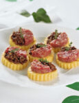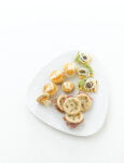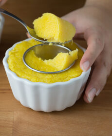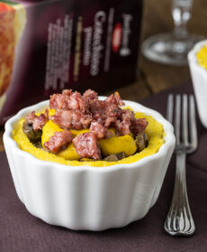 5. È il momento di assemblare tutto: scava con un coppapasta e un cucchiaio la polenta in modo da creare un cestino, adagia i funghi, metti il trito di cotechino e condisci con la salsa di zucca.