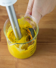 4. Lava la zucca e tagliala a fette spesse circa 2 cm, adagia le fette su una teglia ricoperta di carta forno e cospargi con il rosmarino, la salvia e un filo d’olio. Accendi il forno statico a 180° e quando sarà caldo inforna la zucca e lascia cuocere per 40 minuti. Quando sarà trascorso il tempo, lasciala intiepidire. Trasferisci la zucca e le spezie in un robot da cucina potente, aggiungi il limone, il sale e il latte, frulla fino ad ottenere una crema densa e senza grumi; se ce ne fosse bisogno, per renderlo più cremoso, aggiungi il latte un cucchiaio per volta.