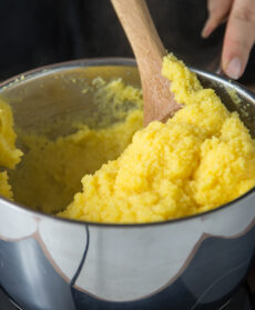 2. Nel frattempo metti sul fuoco 2 litri di acqua in una pentola di acciaio e porta a bollore. Una volta raggiunto il bollore, versa la farina di mais a pioggia mescolando con un cucchiaio di legno, aggiungi anche l’olio di oliva per evitare la formazione di grumi e continua a mescolare. Una volta ripreso il bollore, abbassa il fuoco al minimo e prosegui con la cottura per 50 minuti a fuoco dolce continuando a mescolare, avendo cura di non farla attaccare al fondo. Trascorso il tempo, alza il fuoco in modo da farla staccare bene dal fondo della pentola, riempi fino al bordo le cocotte e lascia raffreddare.