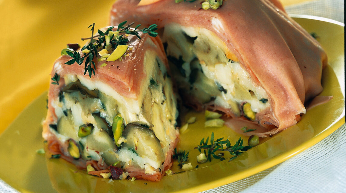 3) A questo punto imburra una terrina di 18 cm di diametro e foderala con le fette di mortadella (tranne una) facendole sbordare; alterna, a strati, le melanzane, il composto di formaggio (che dovrà coprire bene le melanzane) e i pistacchi; chiudi con l'ultima fetta di mortadella e con quelle che sbordano.