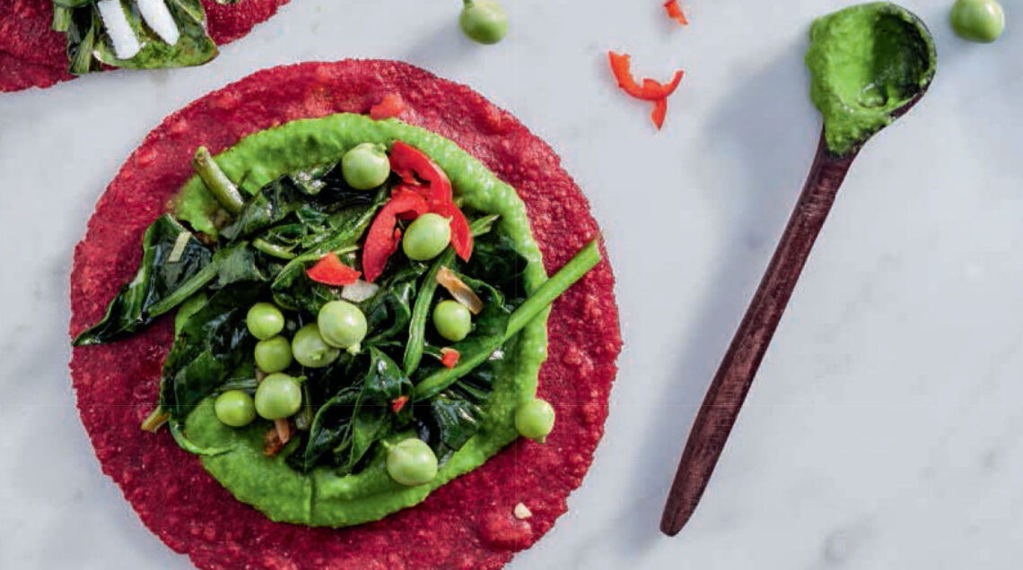 4) Cuoci i tacos 2-3 minuti per lato in una padella antiaderente velata d'olio. Farciscili caldi con 2 cucchiai di crema di piselli e le bietole saltate. Completa con i piselli crudi, la ricotta salata grattuggiata grossolanamente e, se ti piace, qualche filetto di peperoncino.